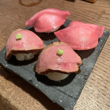 At Soba Kiri in Osaka's Higashisumiyoshi Ward, the menu is a testament to culinary excellence, with each dish meticulously prepared to offer a memorable dining experience. Among the standout offerings is the delightful duck sushi, an unexpected yet exquisite addition that captures the essence of innovative Japanese cuisine. The tender slices of duck, paired with perfectly seasoned rice, create a harmony of flavors that is both surprising and satisfying.