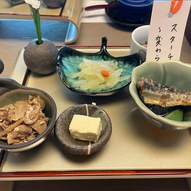 Ce que j'aurais probablement dû commencer par dire (désolé, je me suis laissé emporter par les nouilles) est que c'est un repas kaiseki, qui est, d'après ce que je comprends, un ensemble de plats. Vous obtenez quelques petits apéritifs, une variété de plats, et ils sont tous servis un par un. C'est comme un défilé de saveurs, chacune essayant de surpasser la précédente. Maintenant encore, ce n'est pas un blog de gastronomes, bien que je réalise que je parle beaucoup de restaurants. Voyage et nourriture semblent aller de pair, et mes voyages sont généralement dans le but de manger. Soyons honnêtes, je suis essentiellement un estomac avec des jambes et un appareil photo.