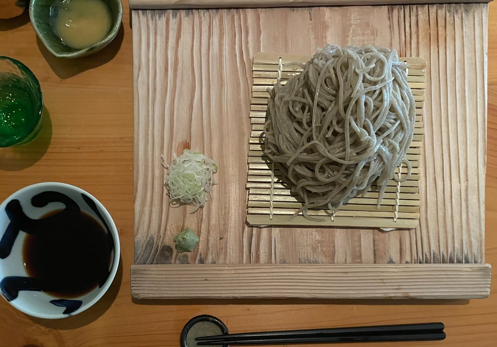 冷たくして山のように盛られた蕎麦は、美しいプレゼンテーションで、箸で崩すのが惜しくなるほどでした。麺の配置には細心の注意が払われており、職人の技と敬意が感じられます。