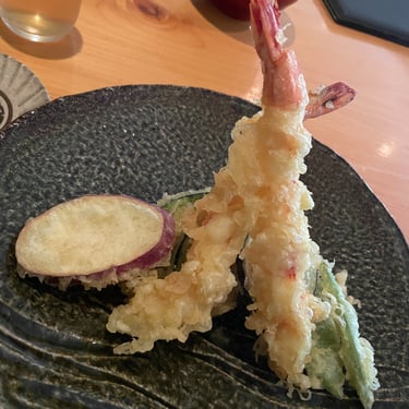 まず、分量についての警告です。とにかく大きいです!エビ天はそれぞれ約25センチもあり、熱々の状態で出され、野菜の種類も豊富です。天ぷらは蒸気を立ててテーブルに運ばれ、衣は軽くてサクサク。一口ごとに満足感を与えてくれます。野菜も新鮮で完璧に調理されており、大きなエビを引き立てています。